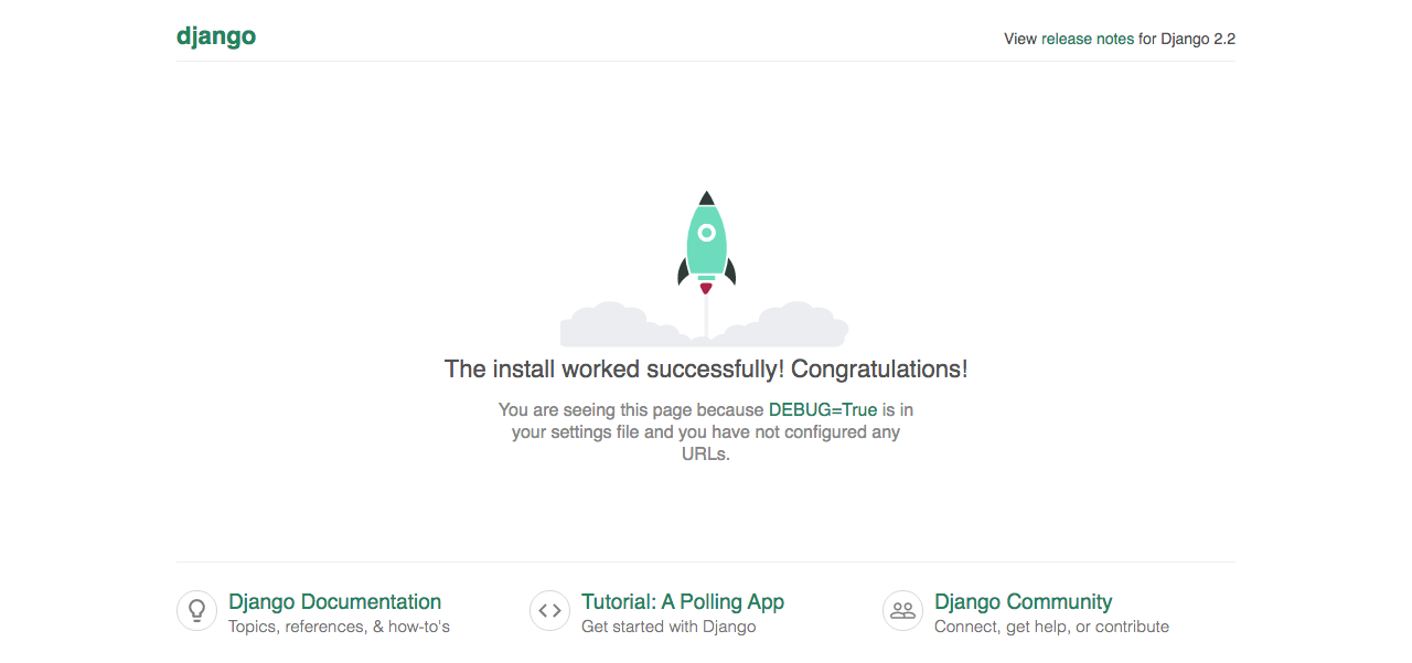 This is the basic starting point of creating a Django project. If everything works fine, pointing the browser to localhost:8000 you’ll see a nice webpage: