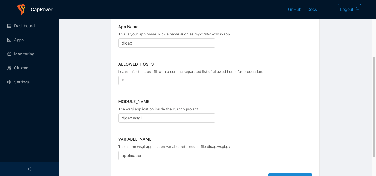 Click “Next”. In the following page, the only field you need to fill is the “App Name”; chose the name you want, but remember that the field “MODULE_NAME” needs to be coherent with the name of the project you choose when you created the Django project (in my case, “djcap.wsgi”).